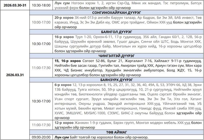 Өнөөдөр буюу гуравдугаар сарын 31-ний өдөр цахилгаан шугам тоноглолд засвар үйлчилгээ хийх хуваарийг танилцуулж байна. Нийслэлийн дөрвөн дүүрэг болон Төв аймагт 09:00-17:30 цагийн хооронд цахилгаан хязгаарлана.