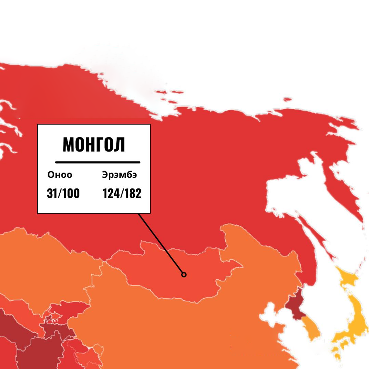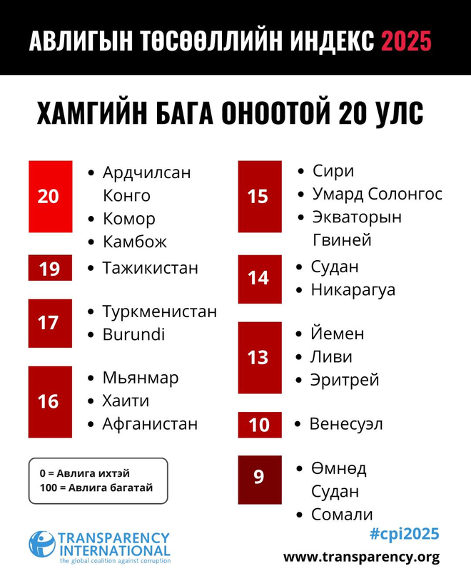 "Транспэрэнси Интернэшнл" Авлигын төсөөллийн индексийн 31 дэх удаагийн тайлангаа танилцууллаа. Манай улс нийт 100 оноо авах ёстойгоор 31 оноо авч дэлхийн 182 орноос 124 дүгээр байрт жагсав. Энэ нь өмнөх оноос 10 байраар ухарсан үзүүлэлт юм.