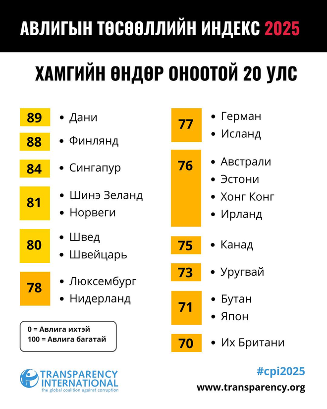 2025 оны Авлигын төсөөллийн индекст дурдсанаар авлига дэлхий даяар улам бүр газар авч, манлайлал сулрахын хэрээр ардчилал бэхэжсэн орнуудад ч авлига ихэссээр байна. Энэ жилийн индексээс харахад арван жилийн өмнө 80-аас дээш оноо авч байсан 12 улс орон байсан бол энэ жил ердөө таван улс болж буурчээ.